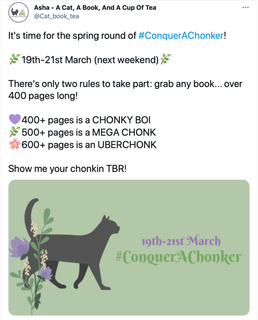 From March 19-21 I participated in Asha @ A Cat, A Book, and A Cup of Tea‘s Conquer a Chonker readathon. The rules to this readathon were simple and included just one rule, read a book over 400 pages.