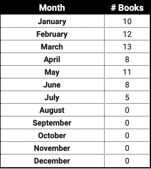 Hello hello, and welcome to the July 2021 Wrap Up here on Literary Weaponry. I talk frequently about my yearly reading slump that happens, without fail, every summer. This year it started creeping up on me in June and really had it’s claws in me throughout July. What amused me most, however, was that despite this being my least productive reading month of 2021 it is right on part with my average reading in previous years. I don’t know what 2021 has done to me but here we are. I’ve been a reading machine.
